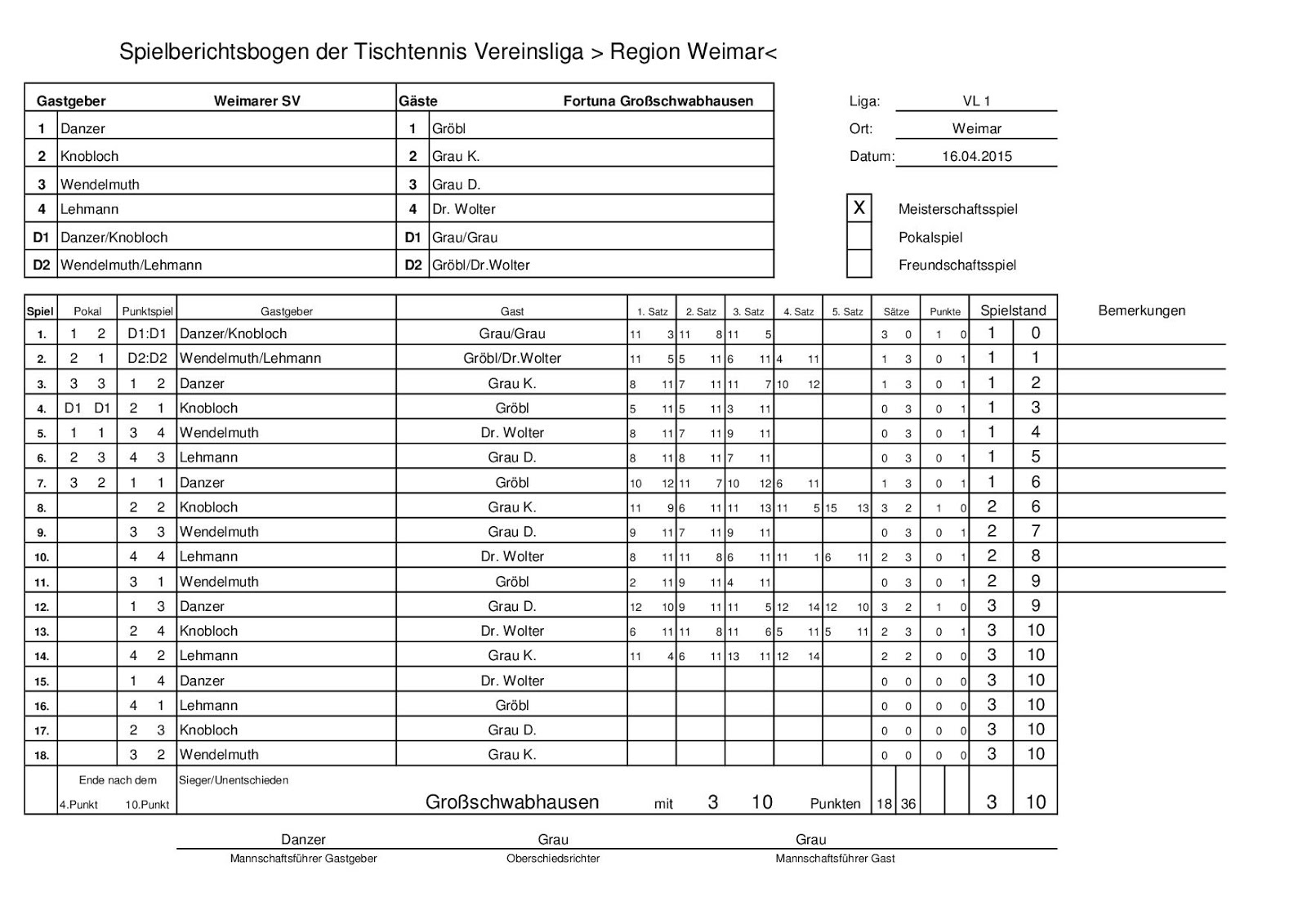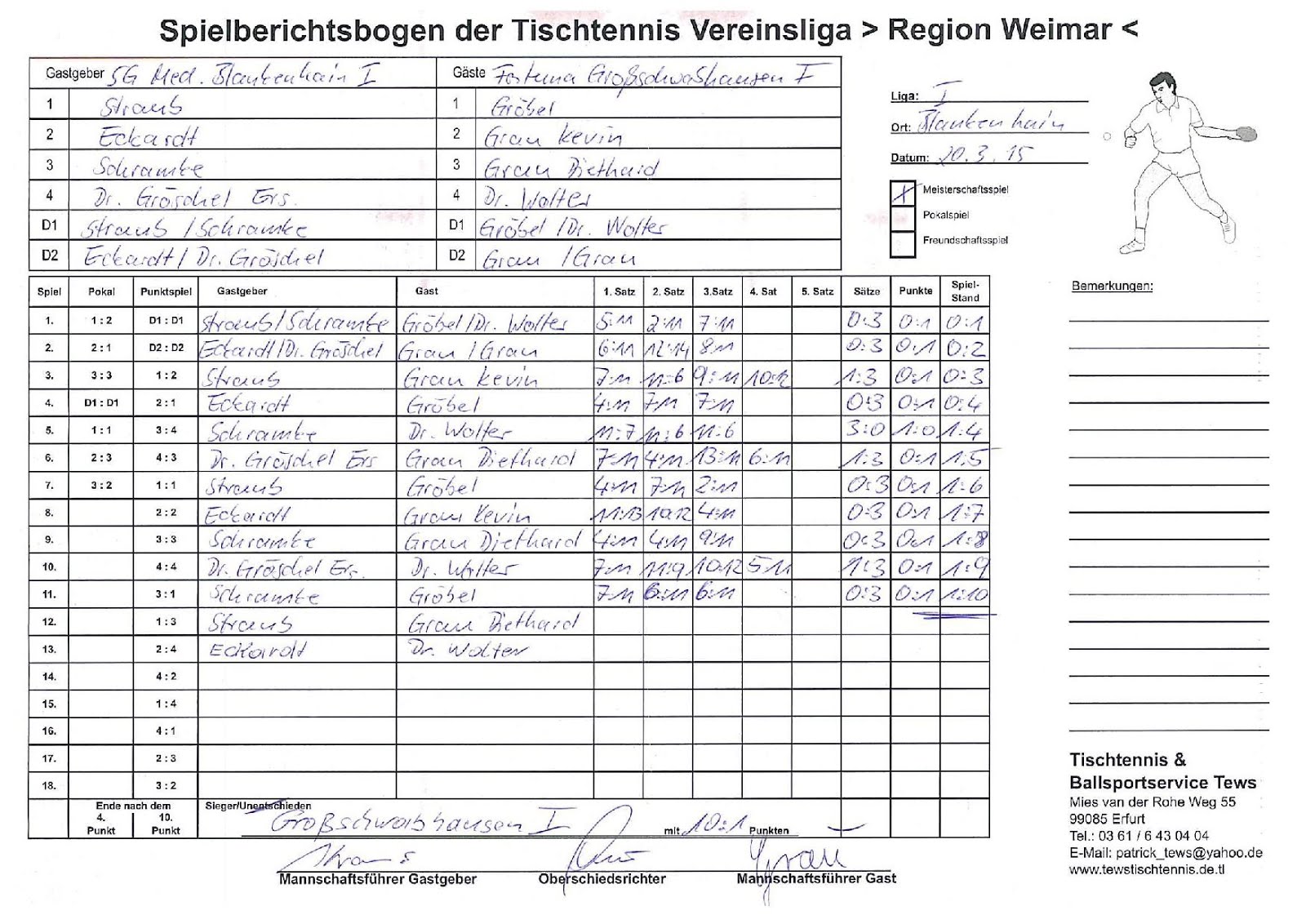 +++ Staffel 1 (22.Spieltag): Blankenhain 1 - Bad Berka F1 0:10 +++ Großschwabhausen 1 - Blankenhain 2 10:0 +++ Großschwabhausen 2 - Tannroda 1 1:10 +++ Berlstedt 1 - TTC V1 10:3 +++ WSV 1 - Bad Berka F2 10:7 +++