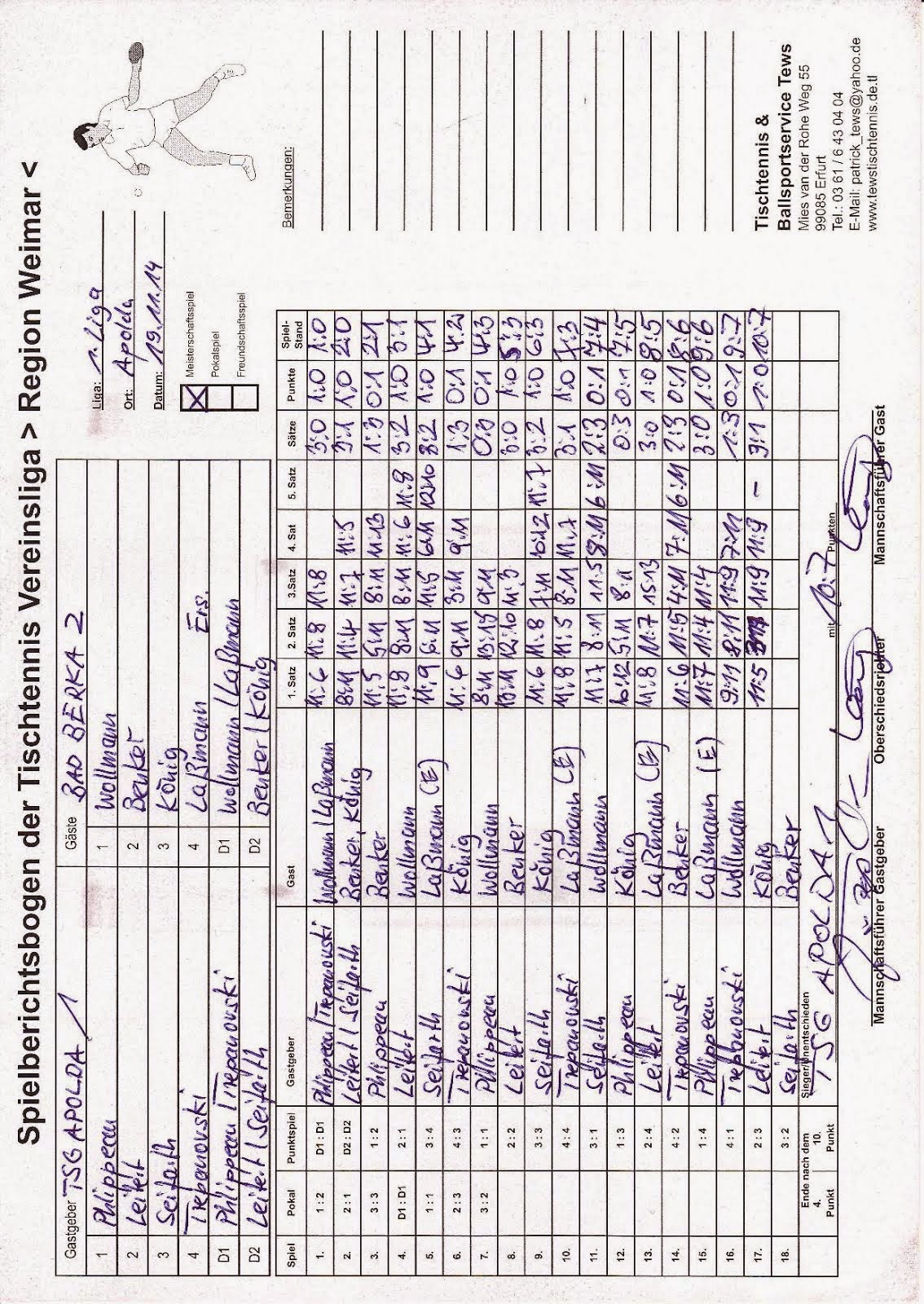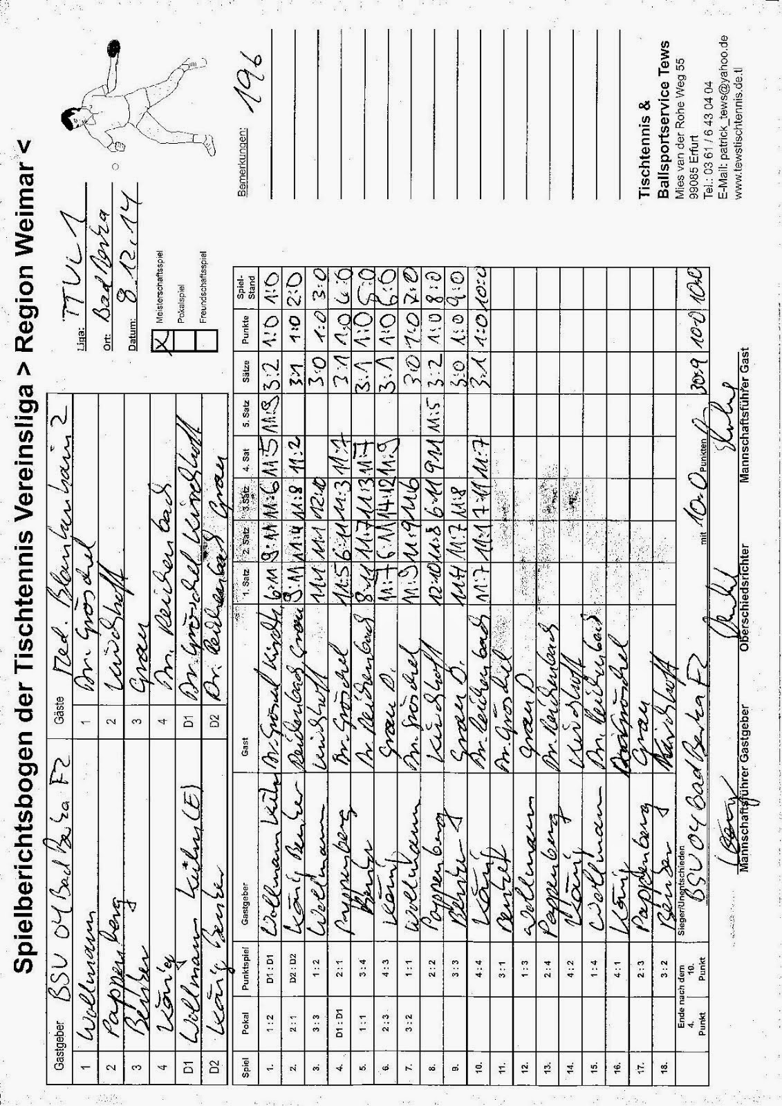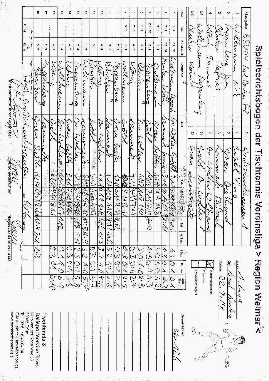 +++ Staffel 1 (22.Spieltag): Blankenhain 1 - Bad Berka F1 0:10 +++ Großschwabhausen 1 - Blankenhain 2 10:0 +++ Großschwabhausen 2 - Tannroda 1 1:10 +++ Berlstedt 1 - TTC V1 10:3 +++ WSV 1 - Bad Berka F2 10:7 +++