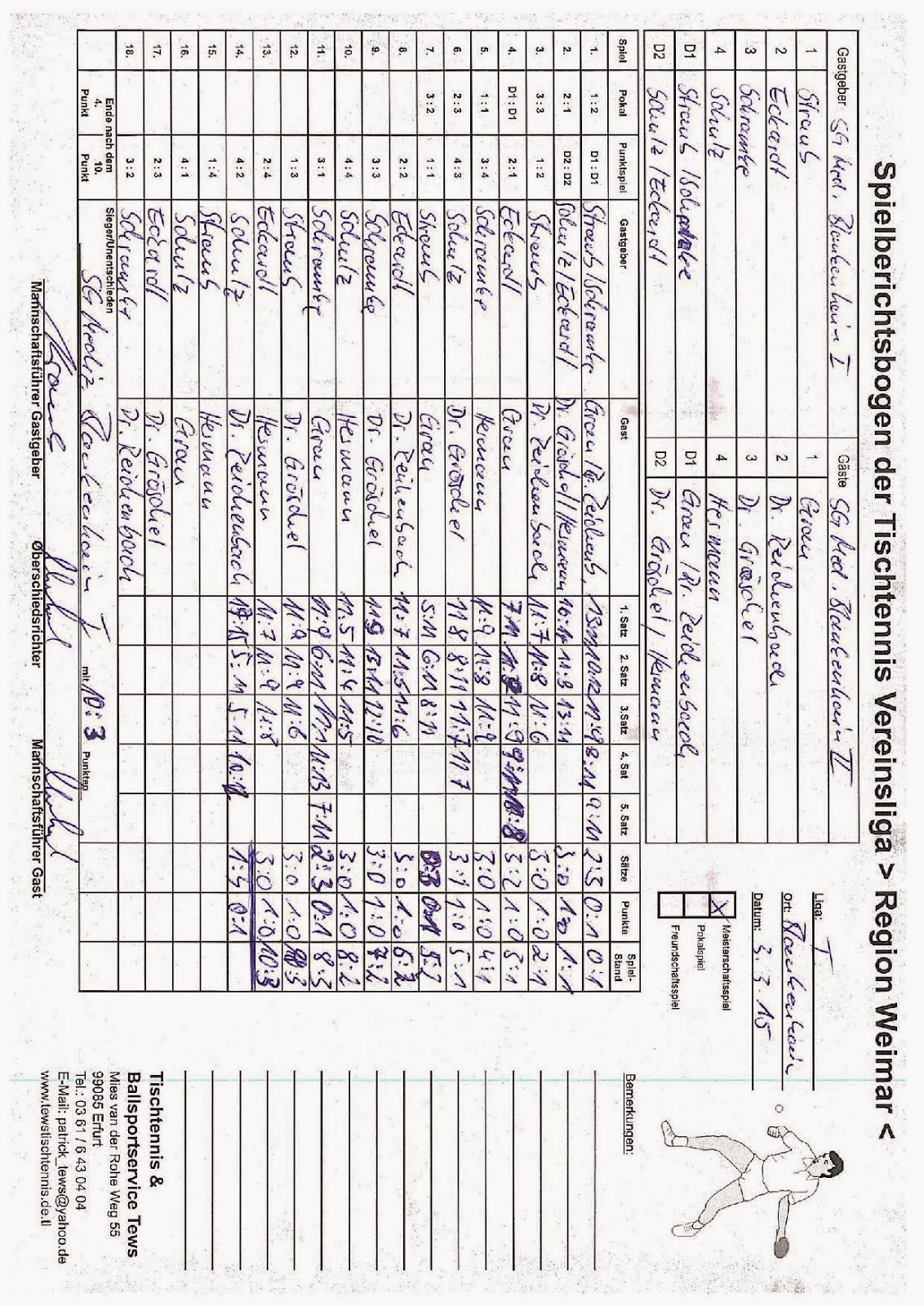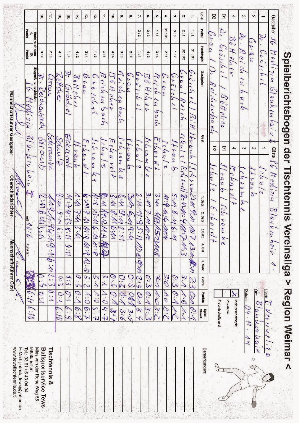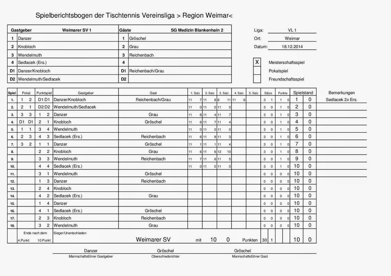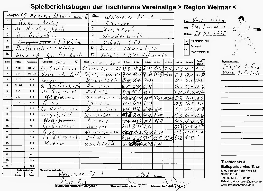 +++ Staffel 1 (22.Spieltag): Blankenhain 1 - Bad Berka F1 0:10 +++ Großschwabhausen 1 - Blankenhain 2 10:0 +++ Großschwabhausen 2 - Tannroda 1 1:10 +++ Berlstedt 1 - TTC V1 10:3 +++ WSV 1 - Bad Berka F2 10:7 +++
