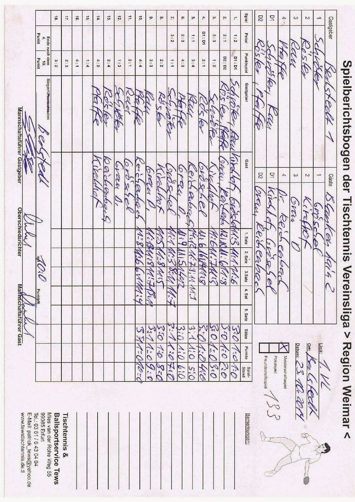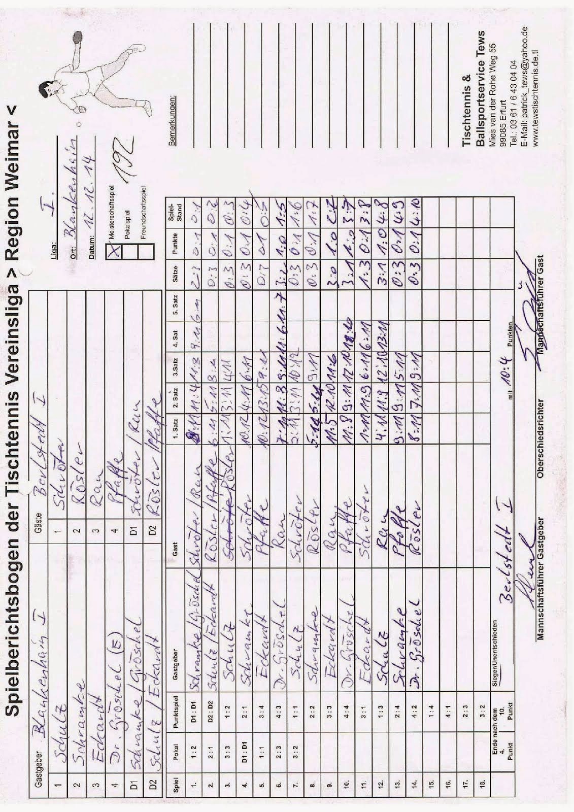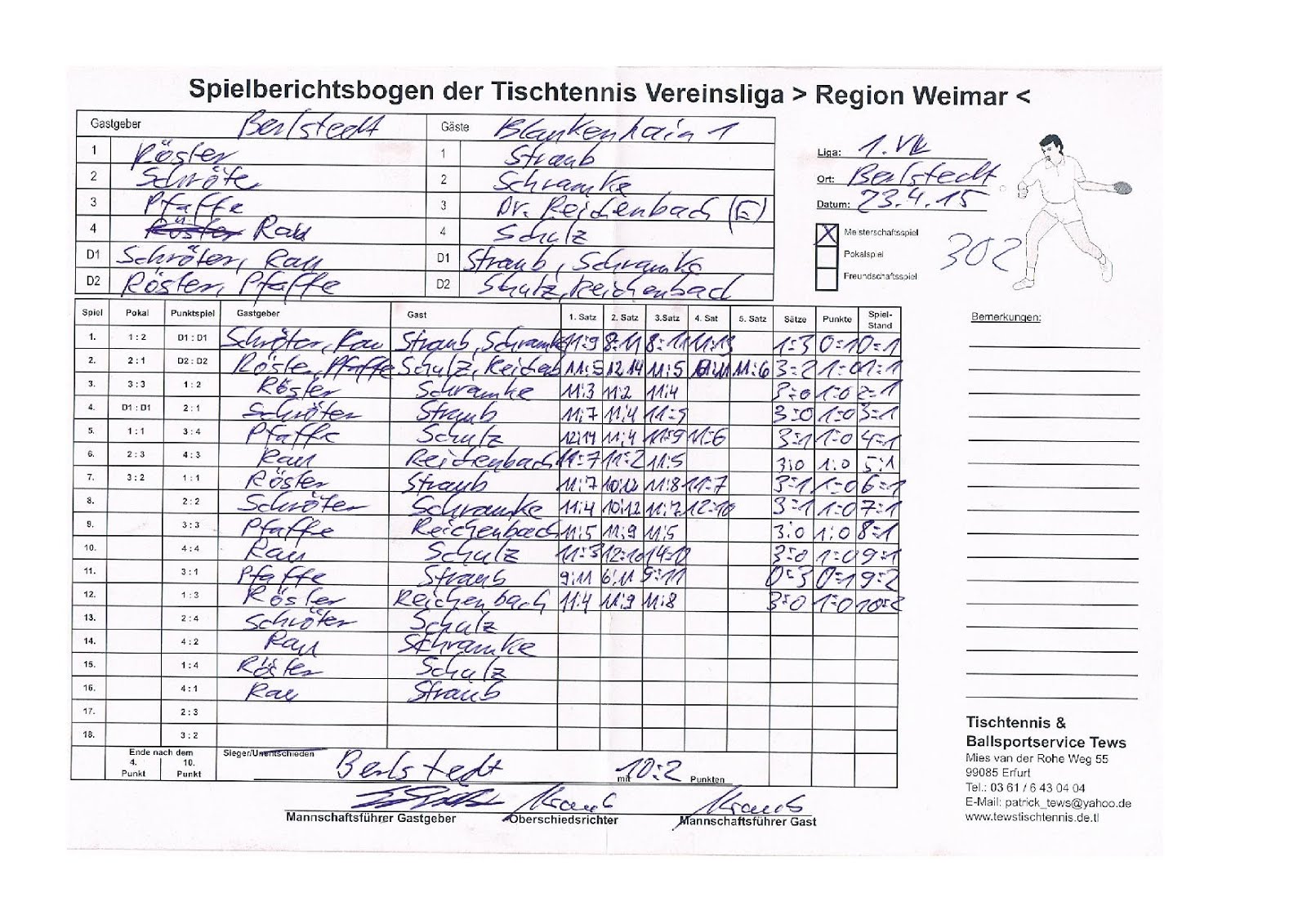 +++ Staffel 1 (22.Spieltag): Blankenhain 1 - Bad Berka F1 0:10 +++ Großschwabhausen 1 - Blankenhain 2 10:0 +++ Großschwabhausen 2 - Tannroda 1 1:10 +++ Berlstedt 1 - TTC V1 10:3 +++ WSV 1 - Bad Berka F2 10:7 +++