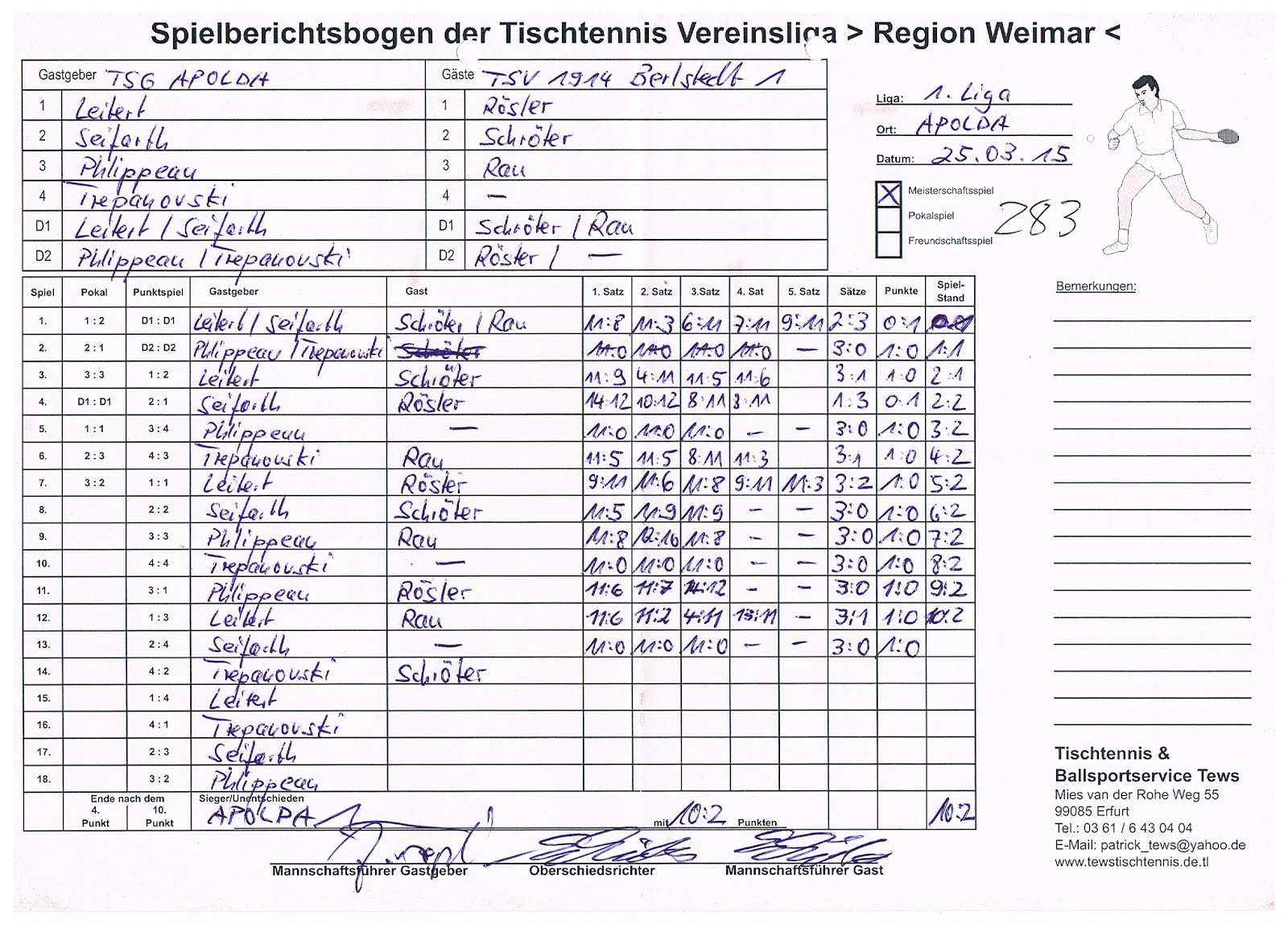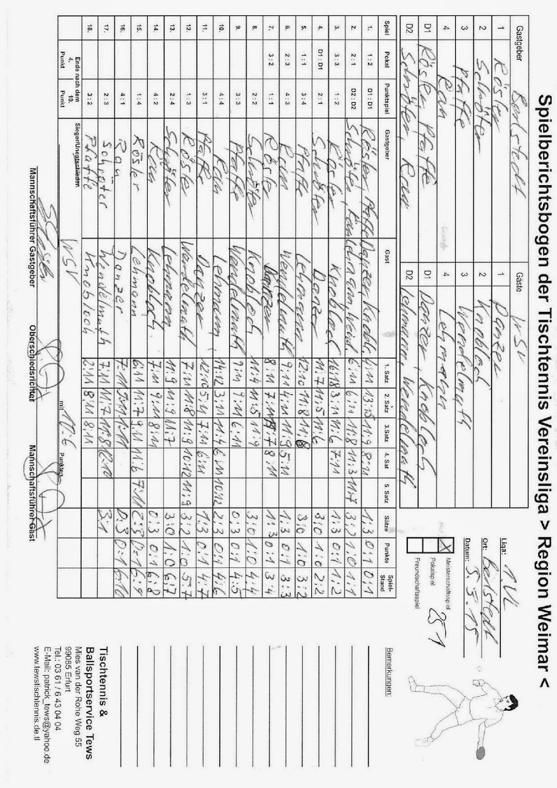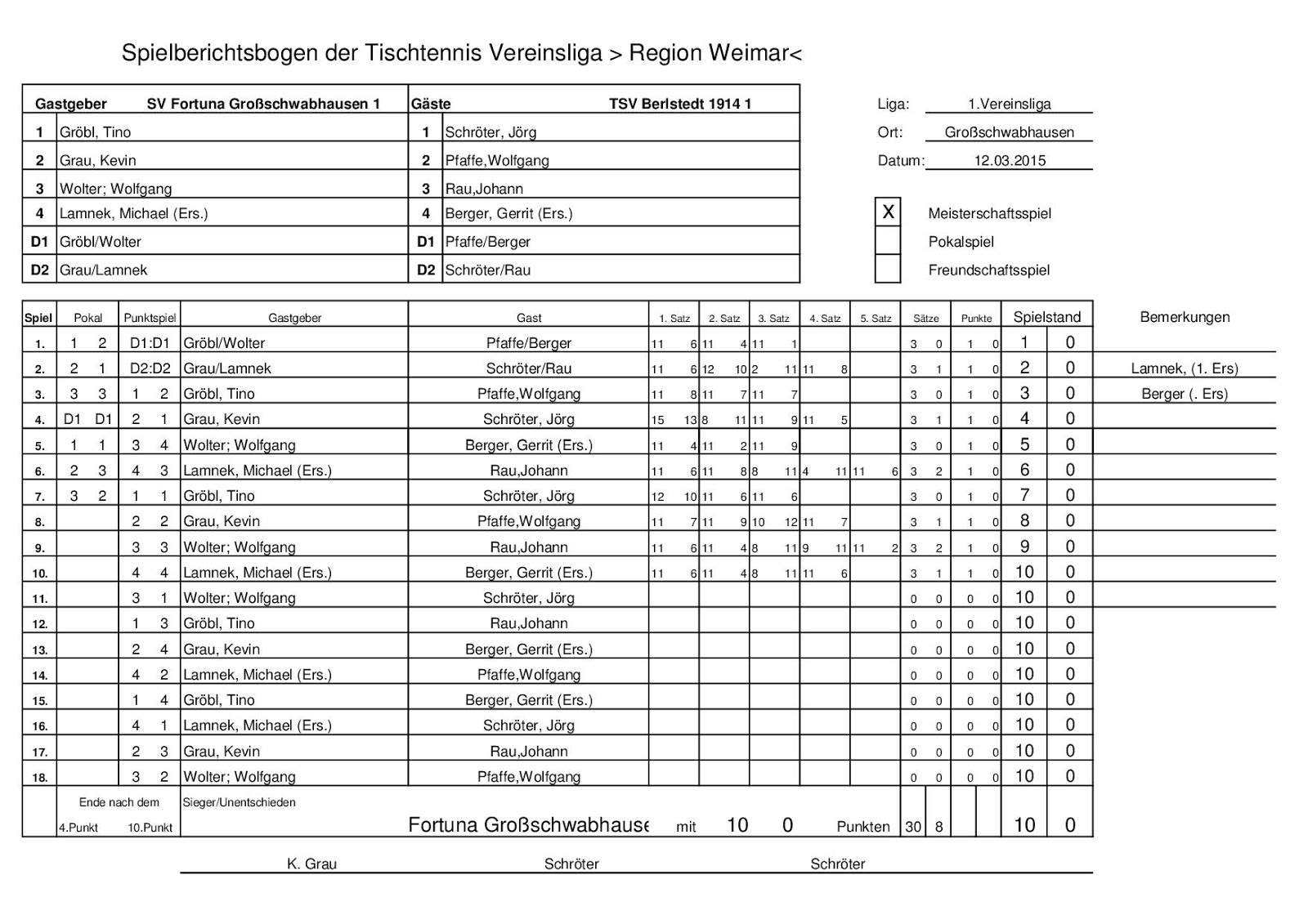 +++ Staffel 1 (22.Spieltag): Blankenhain 1 - Bad Berka F1 0:10 +++ Großschwabhausen 1 - Blankenhain 2 10:0 +++ Großschwabhausen 2 - Tannroda 1 1:10 +++ Berlstedt 1 - TTC V1 10:3 +++ WSV 1 - Bad Berka F2 10:7 +++