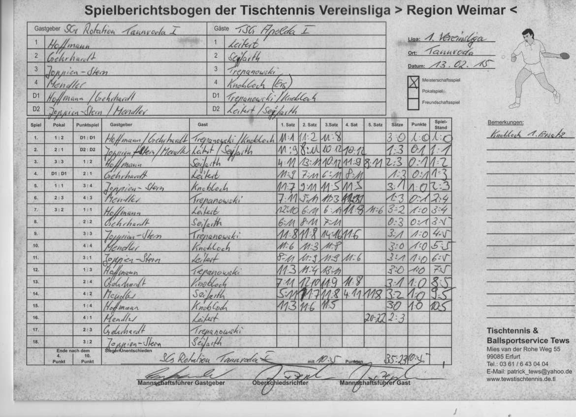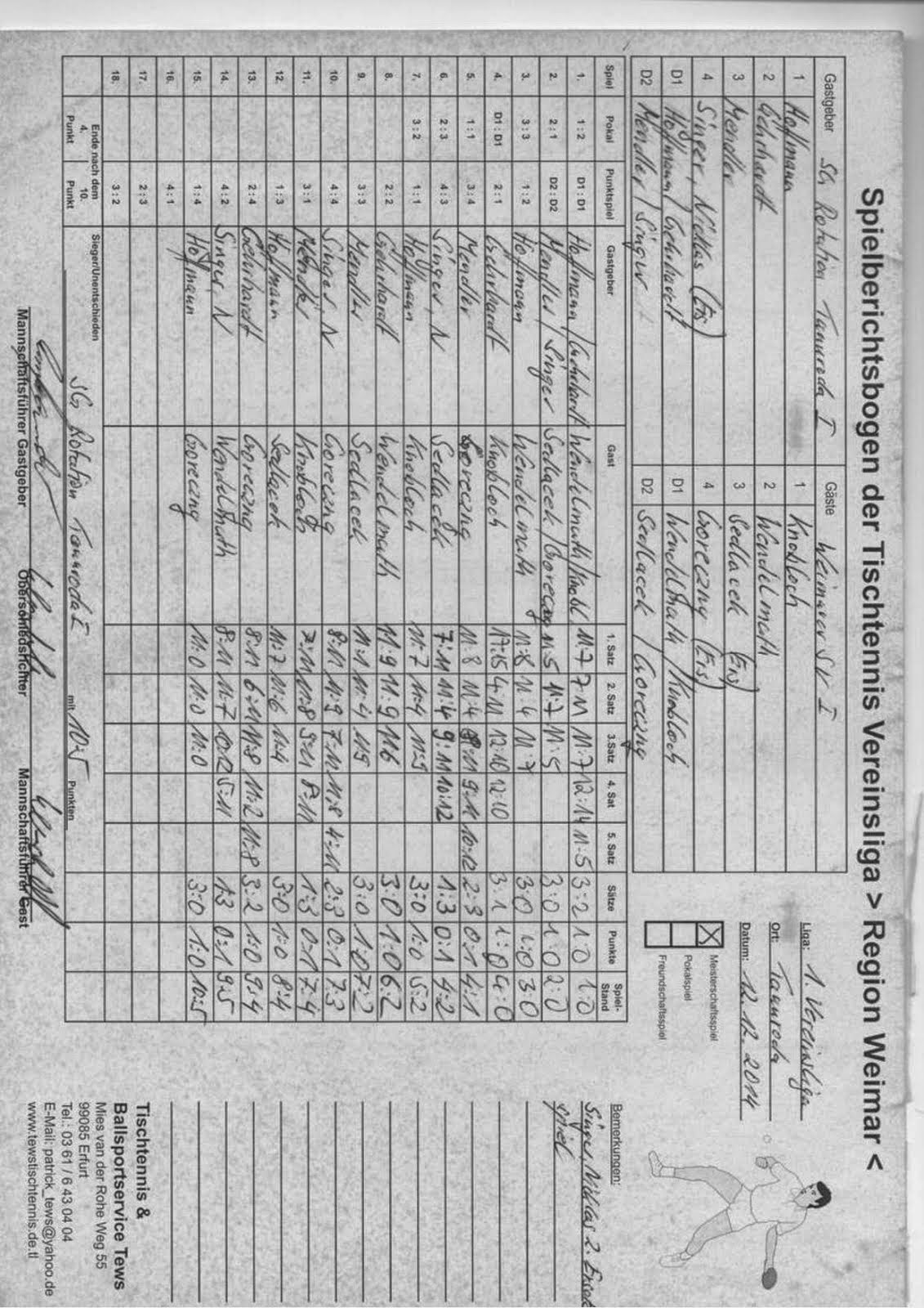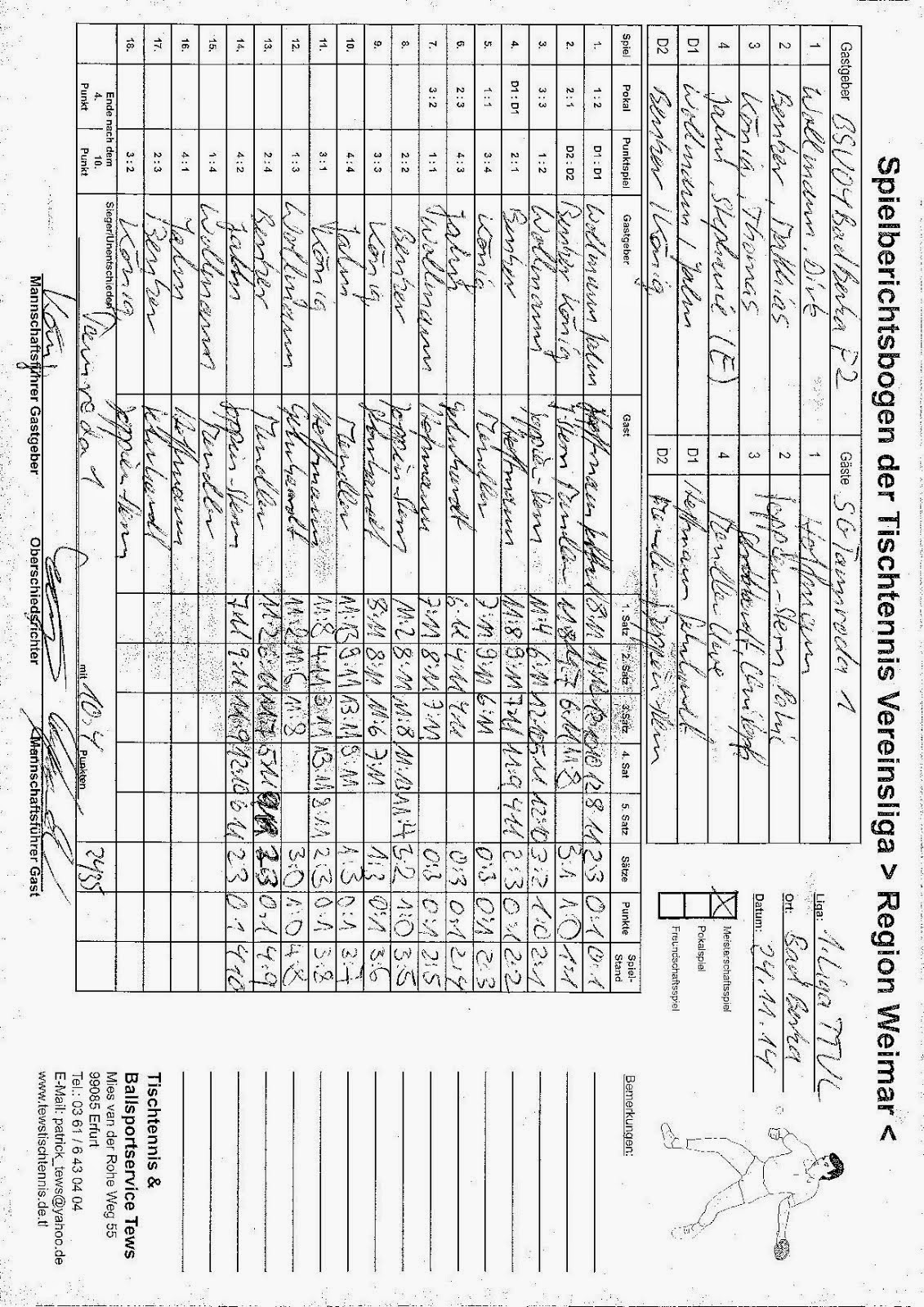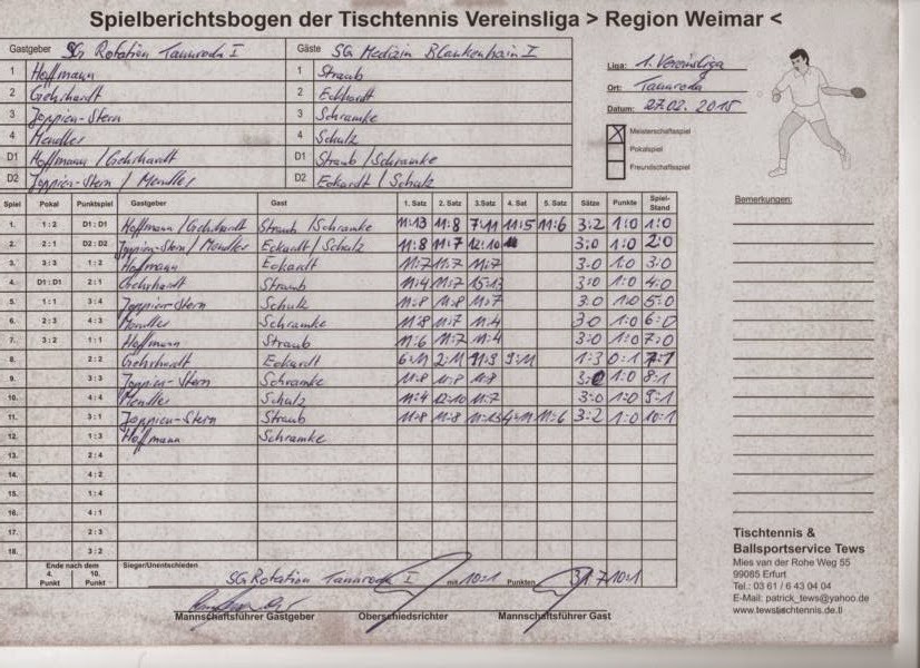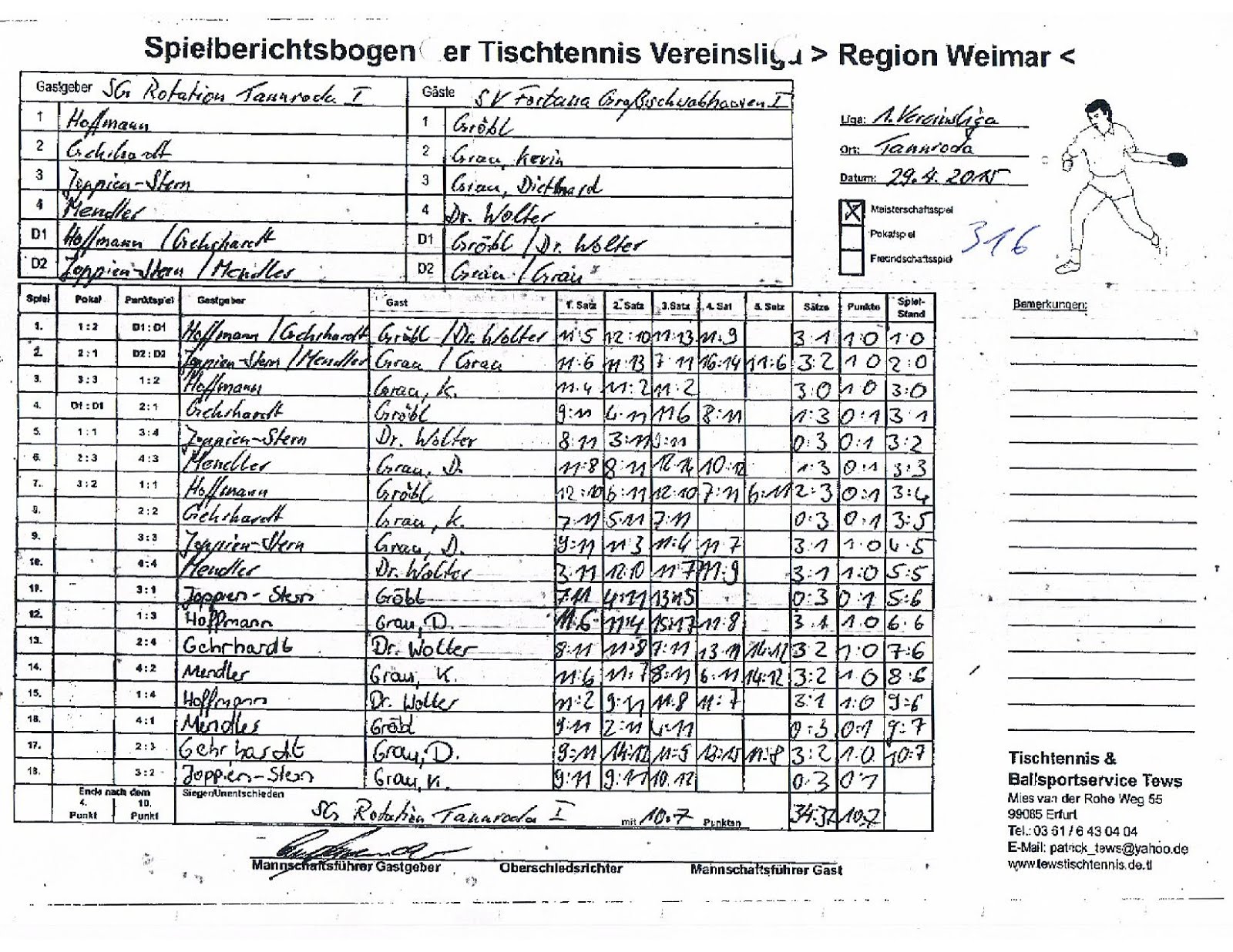 +++ Staffel 1 (22.Spieltag): Blankenhain 1 - Bad Berka F1 0:10 +++ Großschwabhausen 1 - Blankenhain 2 10:0 +++ Großschwabhausen 2 - Tannroda 1 1:10 +++ Berlstedt 1 - TTC V1 10:3 +++ WSV 1 - Bad Berka F2 10:7 +++