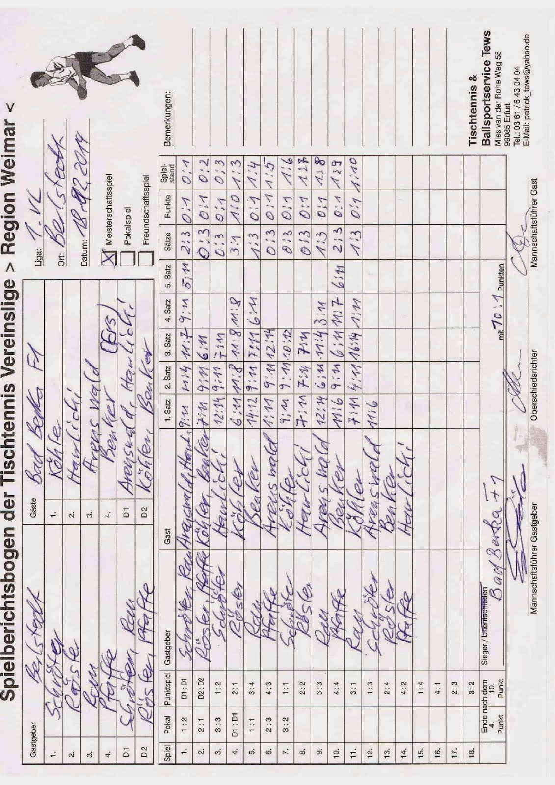 +++ Staffel 1 (22.Spieltag): Blankenhain 1 - Bad Berka F1 0:10 +++ Großschwabhausen 1 - Blankenhain 2 10:0 +++ Großschwabhausen 2 - Tannroda 1 1:10 +++ Berlstedt 1 - TTC V1 10:3 +++ WSV 1 - Bad Berka F2 10:7 +++