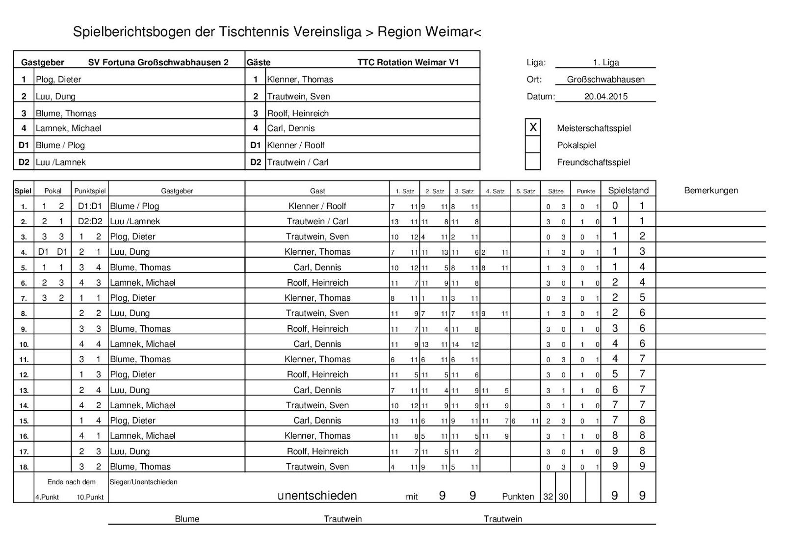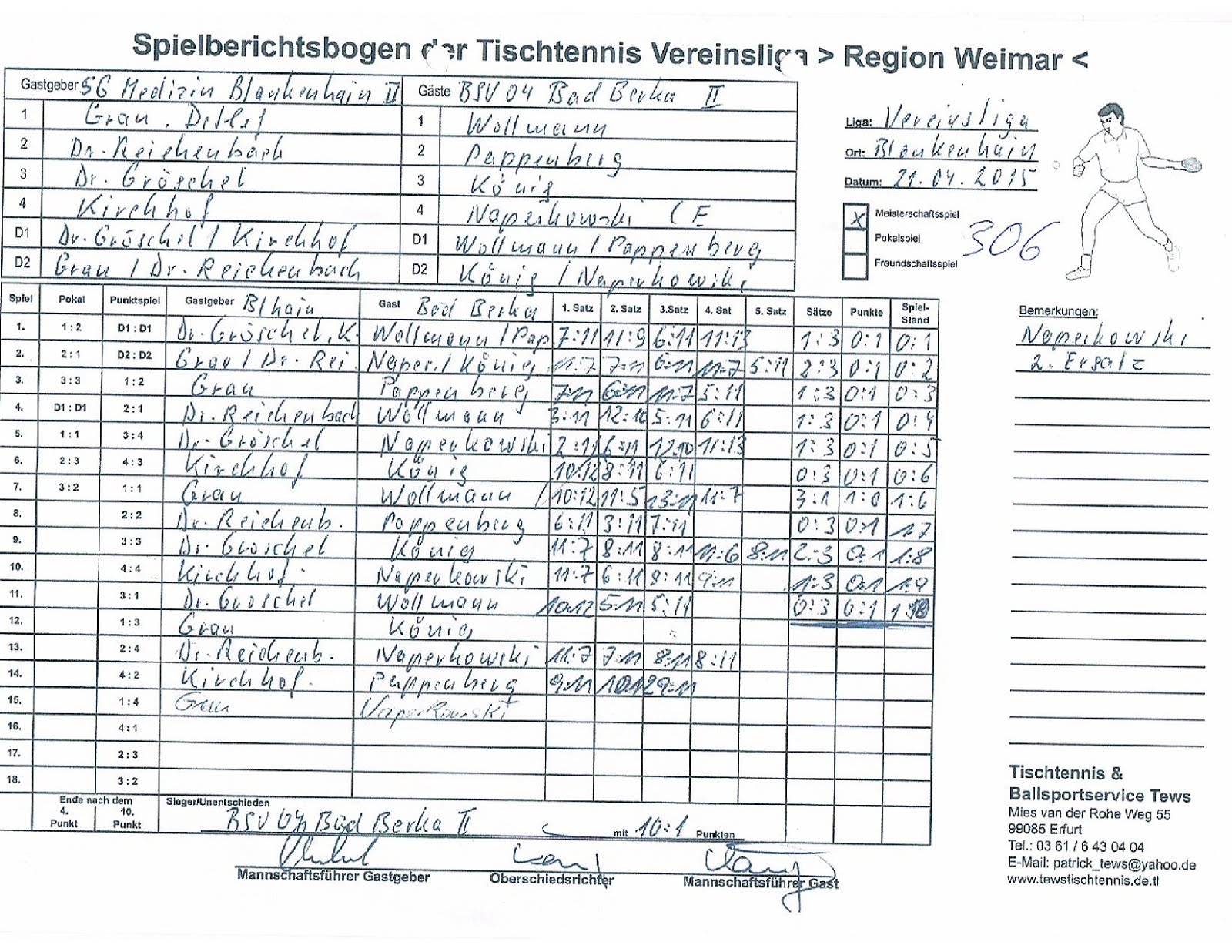 +++ Staffel 1 (22.Spieltag): Blankenhain 1 - Bad Berka F1 0:10 +++ Großschwabhausen 1 - Blankenhain 2 10:0 +++ Großschwabhausen 2 - Tannroda 1 1:10 +++ Berlstedt 1 - TTC V1 10:3 +++ WSV 1 - Bad Berka F2 10:7 +++