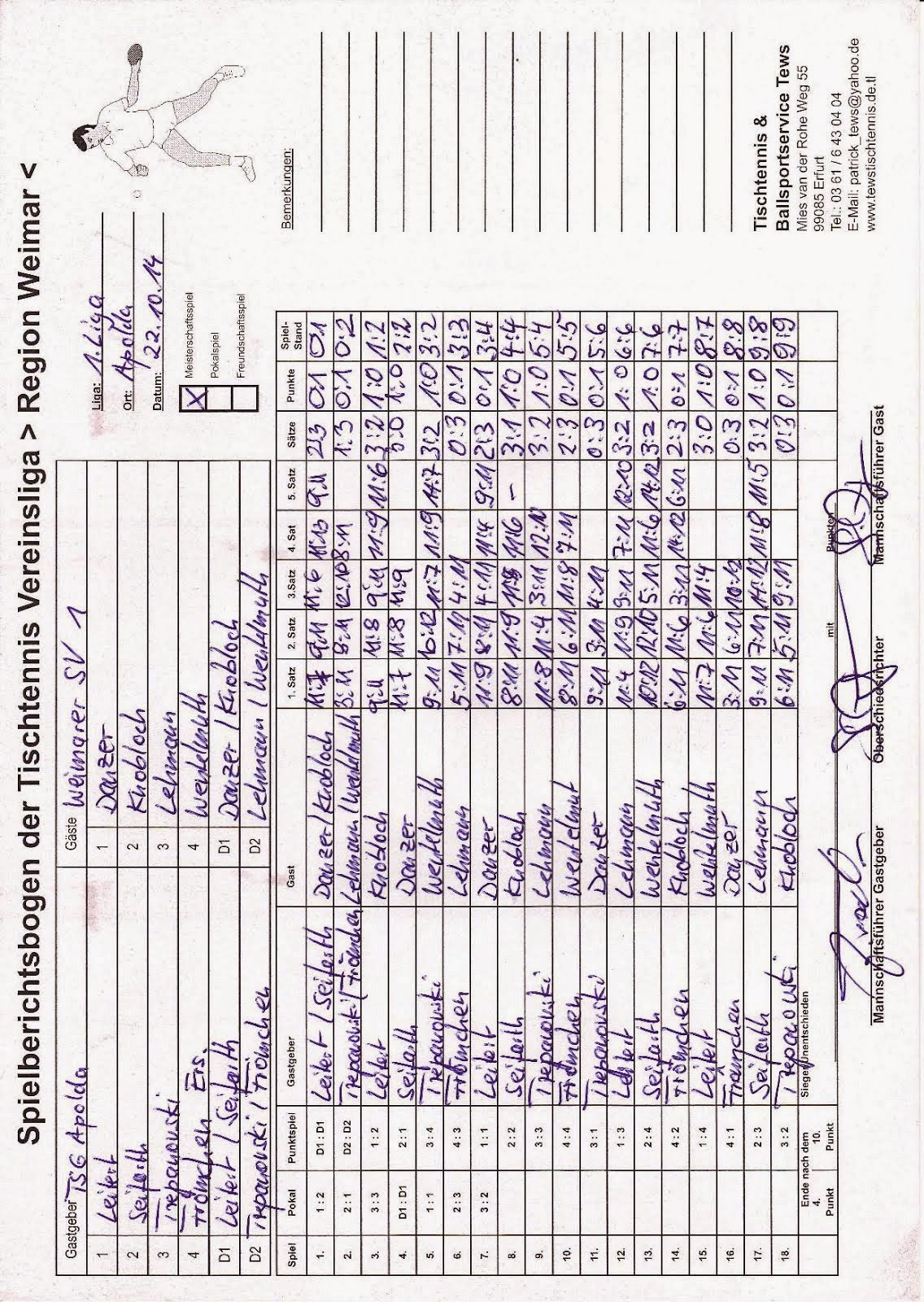 +++ Staffel 1 (22.Spieltag): Blankenhain 1 - Bad Berka F1 0:10 +++ Großschwabhausen 1 - Blankenhain 2 10:0 +++ Großschwabhausen 2 - Tannroda 1 1:10 +++ Berlstedt 1 - TTC V1 10:3 +++ WSV 1 - Bad Berka F2 10:7 +++