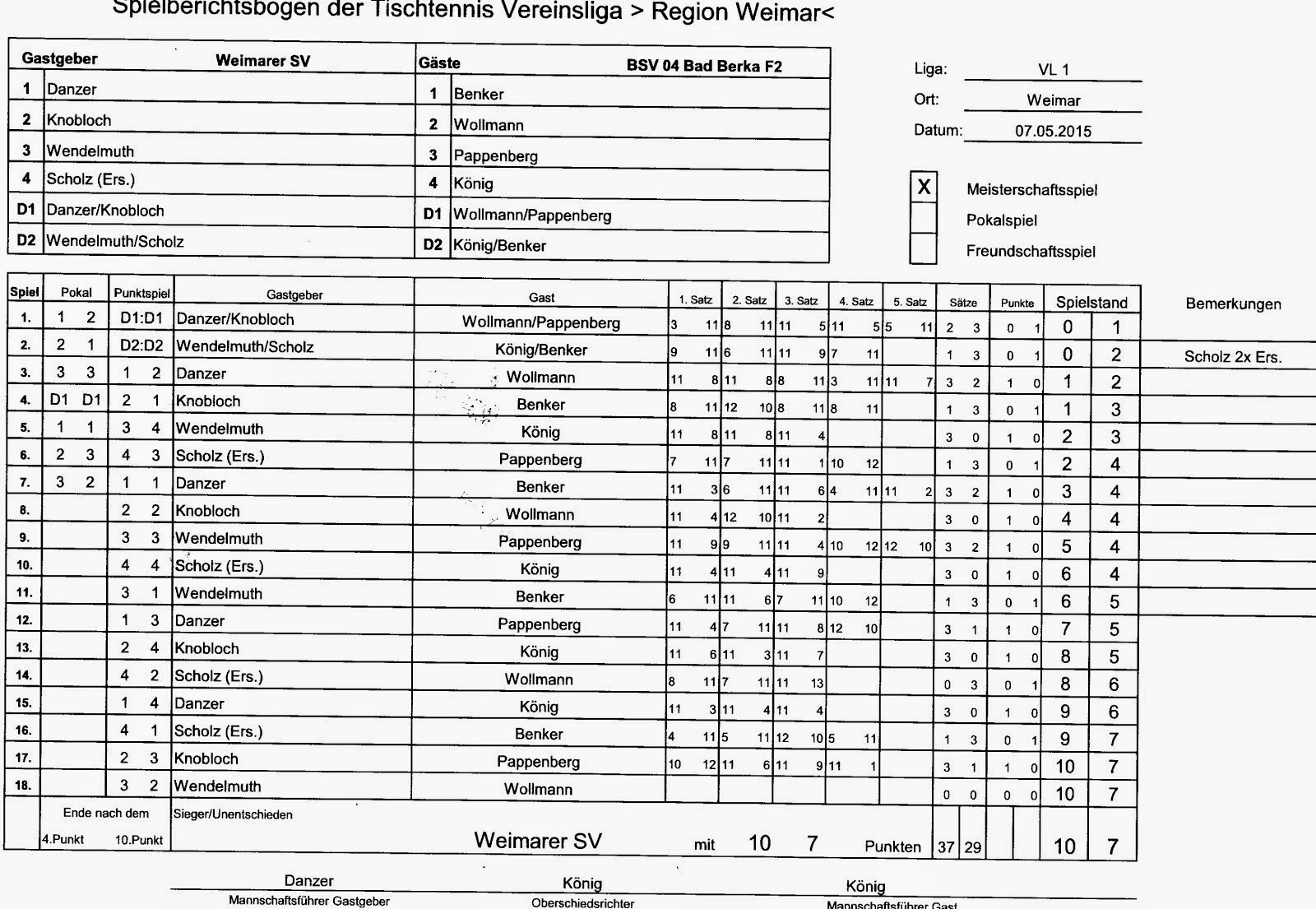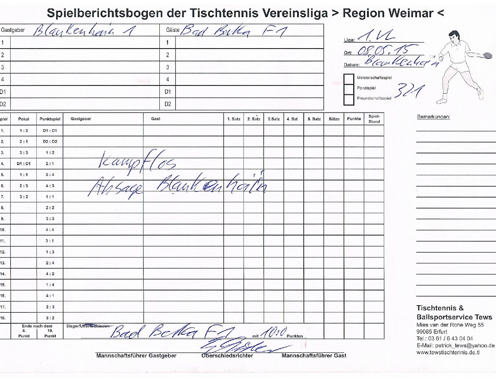+++ Staffel 1 (22.Spieltag): Blankenhain 1 - Bad Berka F1 0:10 +++ Großschwabhausen 1 - Blankenhain 2 10:0 +++ Großschwabhausen 2 - Tannroda 1 1:10 +++ Berlstedt 1 - TTC V1 10:3 +++ WSV 1 - Bad Berka F2 10:7 +++